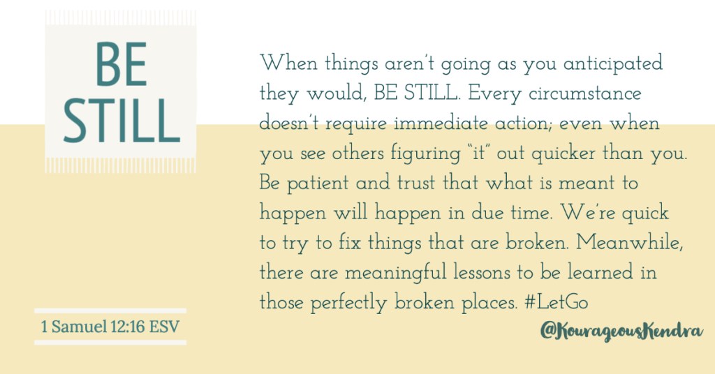 Instead of allowing the circumstances to break me, I had to trust the Holy Spirit to guide me. As much as I wanted to figure things out on my own, revise the plan, and ultimately give up… God’s was like, “Nah, daughter… WE got things to do! You tried it your way… it’s My turn!”